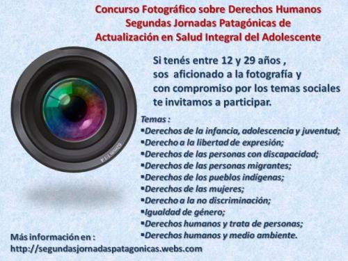 Concurso Fotográfico sobre Derechos Humanos . Segundas Jornadas Patagónicas de Actualización en Salud Integral del Adolescente. Recepción hasta el 31 .03.2015. Más información en : http://www.codajic.org/node/1252 .