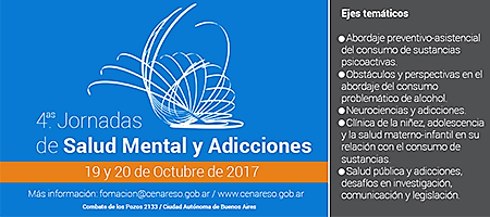 Las 4as Jornadas de Salud Mental y Adicciones están previstas para el 19 y 20 de octubre de 2017. Las mismas se organizarán bajo el lema “Diagnóstico actual y desafíos en Salud Mental y Adicciones”.