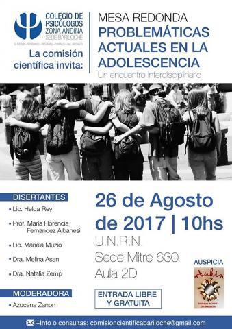 Mesa Redonda "Problemáticas actuales en la adolescencia - Un encuentro interdisciplinario" a realizarse el día 26 de agosto a las 10 hs en instalaciones de la Universidad Nacional de Río Negro, organizado por el Colegio de Psicólogos Zona Andina.