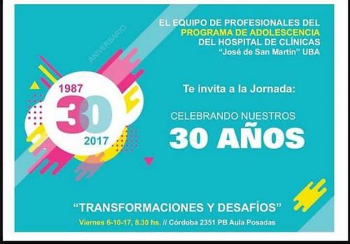 Jornada "Transformaciones y Desafíos " Celebrando nuestros 30 años.Programa de Adolescencia del Hospital de Clínica San Martín. 6 de Octubre de 2017.Córdoba 2351 PB Aula Posadas .CABA Buenos Aires