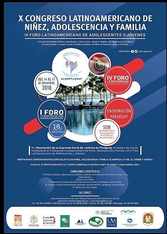 X Congreso Latinoamericano de Niñez, Adolescencia y Familia -IV Foro Latinoamericano de Adolescentes y Jóvenes ALAMPYONAF del 15 al 17 de Noviembre de 2018 Hotel Awa Resort Ruta 1, km 367 Encarnación Paraguay