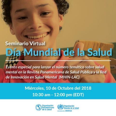 Estimados colegas : Les hacemos una cordial invitación a conectarse el miércoles, 10 de octubre, en el seminario virtual en celebración del "Día Mundial de la Salud Mental". El seminario será un evento especial para lanzar el número temático sobre salud mental en la Revista Panamericana de Salud Pública y la Red de Innovación en Salud Mental (MHIN-LAC).