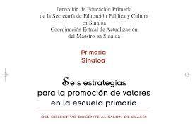 http://www.codajic.org/node/3660 Estrategias para la formación de valores en la escuela primaria. Dirección de Educación Primaria de la Secretaría de Educación Pública y Cultura en Sinaloa- Autores: Epifanio Carrillo Norma Alicia López Ruelas Julia Marisa Ramírez León María de los Ángeles Vargas Gastélum