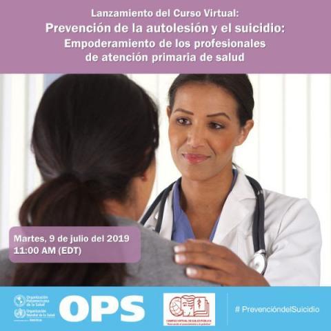 Les hacemos una cordial invitación a participar virtualmente en el lanzamiento de la versión en español del Curso Virtual de la OPS/OMS sobre "Prevención de la Autolesión y el Suicidio: Empoderamiento del personal de salud en la atención primaria", que se realizará el martes, 9 de julio, a las 11:00 am, hora de Washington D.C.