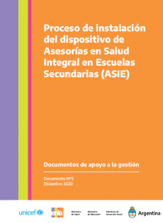 http://www.codajic.org/node/4605 Proceso de instalación del dispositivo deAsesorías en SaludIntegral en EscuelasSecundarias (ASIE) Autoras: Alejandra Beccaria- Patricia Dávolos-Tamar Finzi-Natalia Gualdoni-Ministerio de Salud de la Nación - Fondo de lasNaciones Unidas para la Infancia (UNICEF), 1°edición, Buenos Aires, diciembre 2020. El presente documento es el resultado del trabajo de campo en tres provincias (Salta,Tucumán y Misiones) con el propósito de caracterizar el funcionamiento actual de las Asesorías en Salud Integral en Escuelas Secundarias (ASIE), desde la perspectiva de los distintos actores institucionales en los espacios subnacionales. El informe recupera el proceso de instalación, sus logros en el tiempo transcurrido y los desafíos que surgen a partir de esta primera etapa de puesta en marcha en el marco del Plan ENIA.El análisis realizado muestra importantes avances, pero aún se requieren significativas mejoras producto de los desafíos que abre la irrupción de las ASIE.