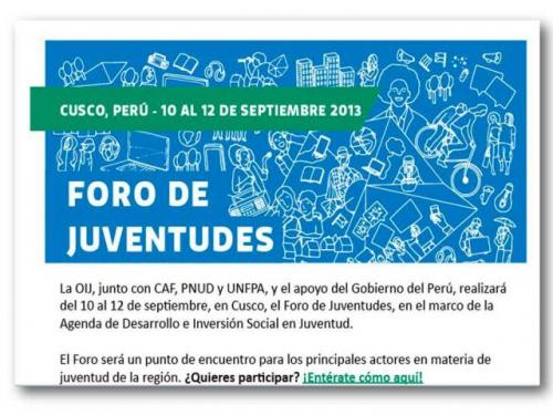 Un punto de encuentro para los principales actores en materia de juventud de la región; un espacio que no busca nuevas institucionalidades sino ser simplemente el lugar donde todos aquellos que trabajan la agenda juvenil de la región puedan encontrarse. Con ese espíritu se pone en marcha el camino hacia el Foro de Juventudes, que la OIJ organizará del 10 al 12 de septiembre en Cusco, con el apoyo del Gobierno de ese país, el Ministerio de Educación, la Secretaría Nacional de la Juventud y el gobierno regional. El Foro de Juventudes reunirá durante esos días a representantes de seis grandes grupos: gobiernos, organizaciones de la sociedad civil, movimientos sociales, estudiantiles y políticos, sector privado y emprendedores, academia y cooperación internacional. El encuentro de Cusco será, sin dudas, una pieza clave en el proceso de construcción de la Agenda de Desarrollo e Inversión Social en Juventud que encara la OIJ junto con otros socios y actores de la cooperación internacional, en la medida en que este contexto supone una gran oportunidad para establecer un enfoque estratégico que facilite la participación juvenil en el desarrollo de políticas públicas y en la agenda de inversión social en la región.Para ello, la OIJ seleccionará, junto a los socios de la iniciativa, a los participantes del encuentro en función de su representación institucional, visibilidad y liderazgo.Sin embargo, habrá una cuota del 20% (unas 25 personas) que surgirá de una convocatoria abierta y pública en toda la región. ¿Quiénes podrán postular? Jóvenes iberoamericanos de entre 15 y 35 años, que deberán completar un formulario con datos personales y de la institución a la que representan. La organización asumirá los costos de traslado internacional, alojamiento y alimentación de los seleccionados.Los postulantes tienen tiempo de enviar sus formularios a agenda@oij.org hasta el 7 de agosto, inclusive. Los seleccionados serán dados a conocer el 15 de agosto.