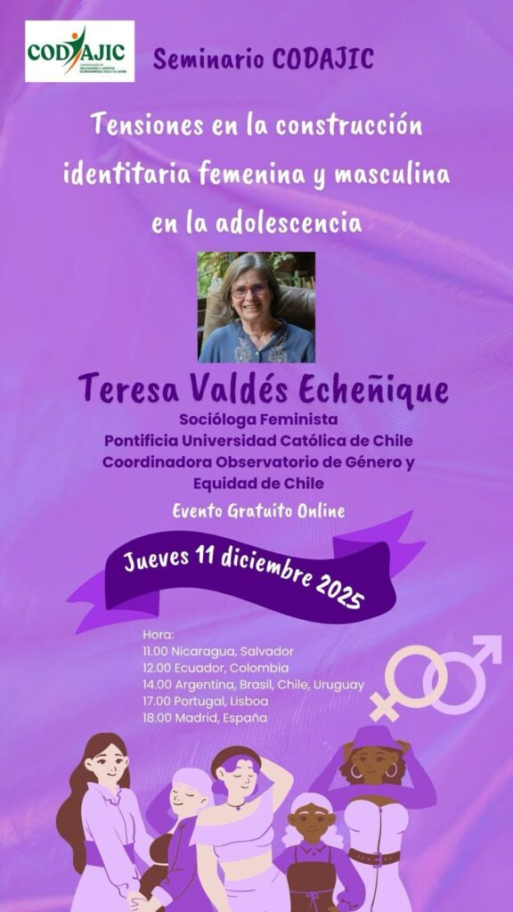 En este nuevo Seminario CODAJIC, la destacada socióloga feminista Teresa Valdés Echeñique abordará los desafíos y tensiones que atraviesan las y los adolescentes en la construcción de sus identidades femeninas y masculinas. Una instancia formativa para profundizar en enfoques de género, equidad y desarrollo adolescente. Actividad gratuita y online.